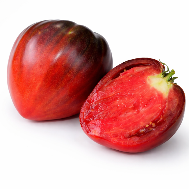 Tomate de couleur indigo à chair dense au goût doux avec peu d'acidité.