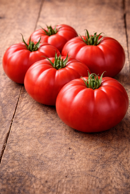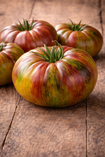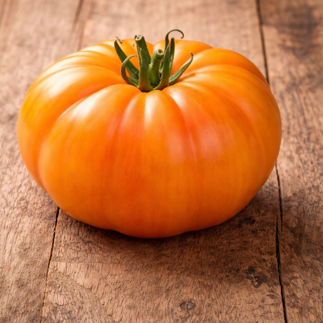 Belle tomate orange abricot aplatie et côtelée à chair dense contenant peu de graines. Excellente qualité gustative. Feuillege de pomme de terre.