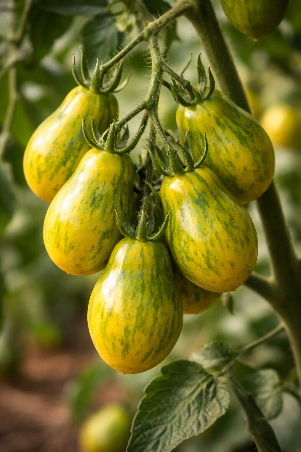 Variété américaine issue d'une mutation de la Green Zebra aux petits fruits en forme de poire vert jaune strié de vert à maturité. Saveur fruitée.